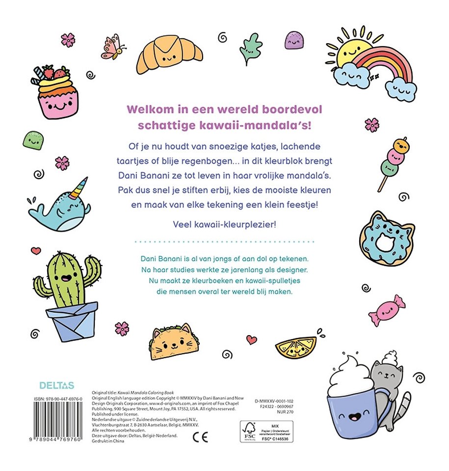 In dit kleurblok vind je geen standaard mandalapatronen, maar speelse cirkels boordevol snoezige katjes, lachende taartjes en blije regenbogen. Illustrator Dani Banani combineert de rust en balans van mandala's met haar onweerstaanbaar schattige kawaii-stijl. Bij het inkleuren zul je dus niet alleen rustig worden maar tegelijkertijd een lach op je gezicht krijgen door al die snoezige tekeningen.