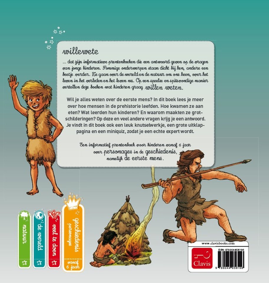 Wil je alles weten over de eerste mens? In dit boek lees je meer over hoe mensen in de prehistorie leefden. Hoe kwamen ze aan eten? Wat leerden hun kinderen? En waarom maakten ze grotschilderingen? Op deze en veel andere vragen krijg je een antwoord. Je vindt in dit boek ook een leuk knutselwerkje, een grote uitklap-pagina en een miniquiz, zodat je een echte expert wordt.