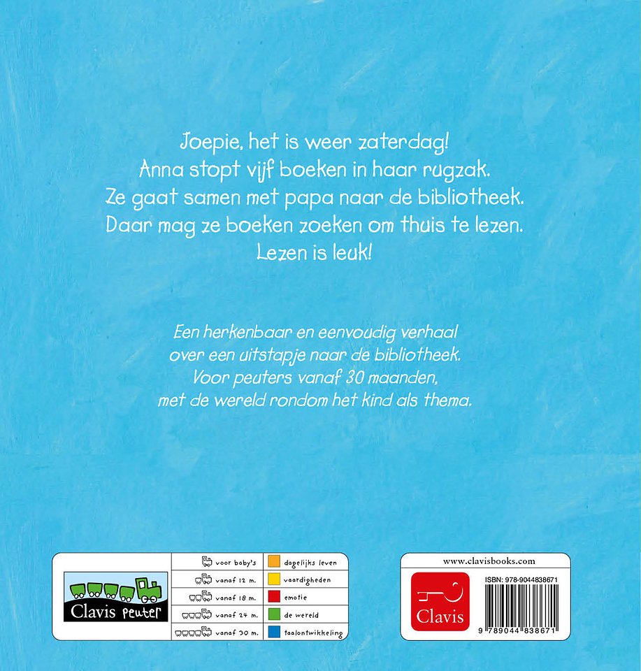 Joepie, het is weer zaterdag! Anna stopt vijf boeken in haar rugzak. Ze gaat samen met papa naar de bibliotheek. Daar mag ze boeken zoeken om thuis te lezen. Lezen is leuk!
