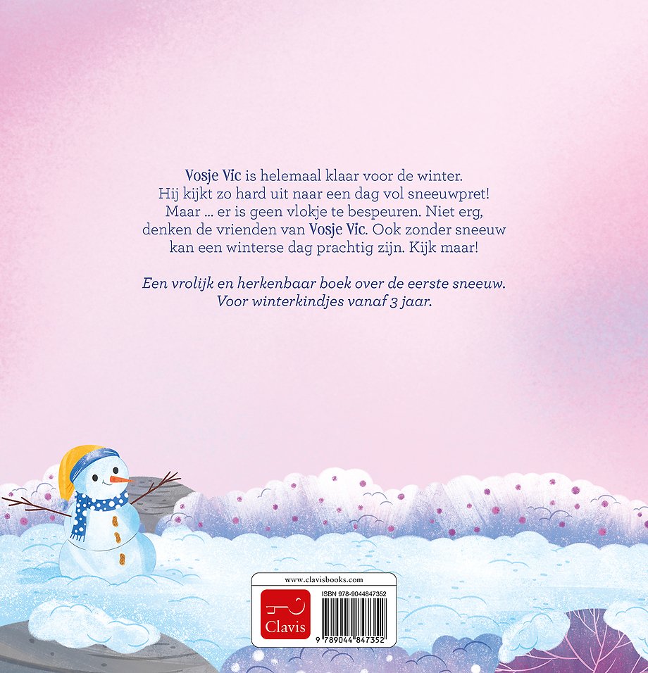 Vosje Vic is helemaal klaar voor de winter. Hij kijkt zo hard uit naar een dag vol sneeuwpret! Maar … er is geen vlokje te bespeuren. Niet erg, denken de vrienden van Vosje Vic. Ook zonder sneeuw kan een winterse dag prachtig zijn. Kijk maar!