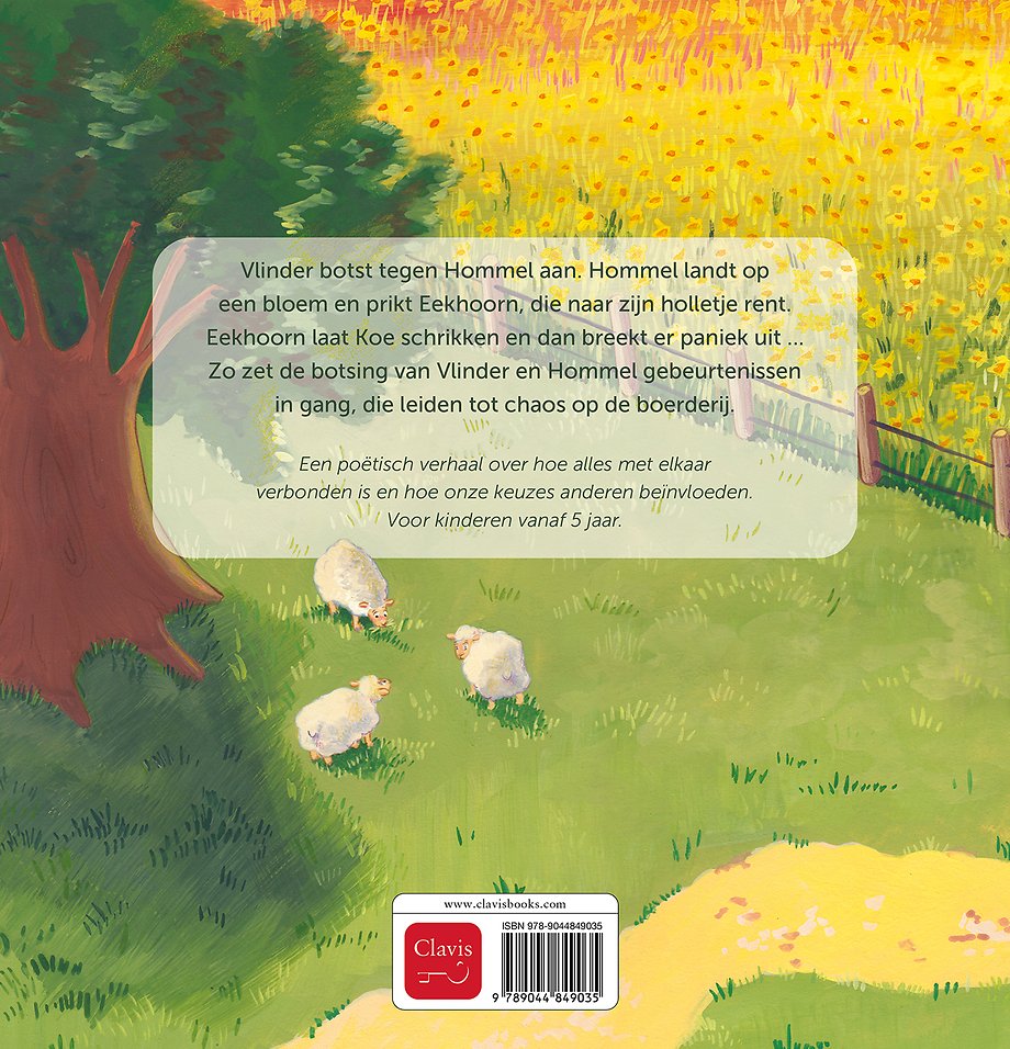 Vlinder botst tegen Hommel aan. Hommel landt op een bloem en prikt Eekhoorn, die naar zijn holletje rent. Eekhoorn laat Koe schrikken en dan breekt er paniek uit … Zo zet de botsing van Vlinder en Hommel gebeurtenissen in gang, die leiden tot chaos op de boerderij.