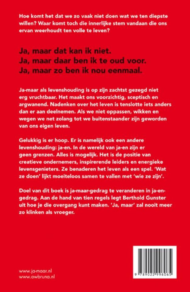 Doel van dit boek is Ja-maar-gedrag te veranderen in Ja-en-gedrag. Aan de hand van tien regels legt Berthold Gunster uit hoe u die overgang kunt maken. 'Ja, maar' zal nooit meer zo klinken als vroeger.