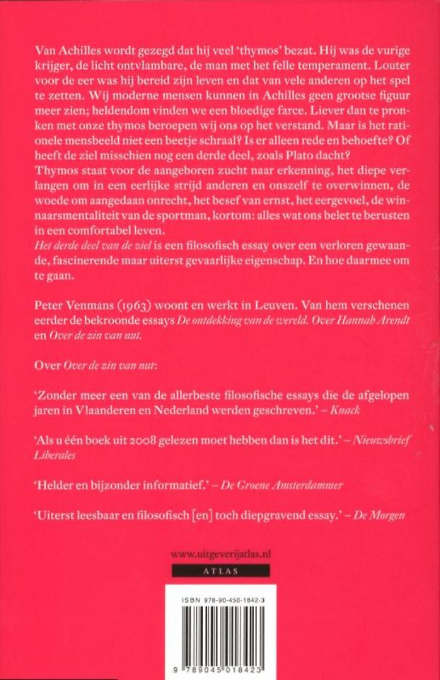 Van Achilles wordt gezegd dat hij veel 'thymos' bezat. Hij was moedig, vurig, hartstochtelijk, licht ontvlambaar, een geboren krijger. Louter voor de eer was hij bereid zijn leven en dat van vele anderen op het spel te zetten. Wij modernen kunnen in Achilles geen grootse figuur meer zien; heldendom vinden we een bloedige farce. Liever dan te pronken met onze thymos beroepen wij ons op het verstand. Maar is het rationele mensbeeld niet een beetje schraal? Is er alleen rede en behoefte? Of bestaat er misschien een derde deel in de ziel, zoals Plato dacht?