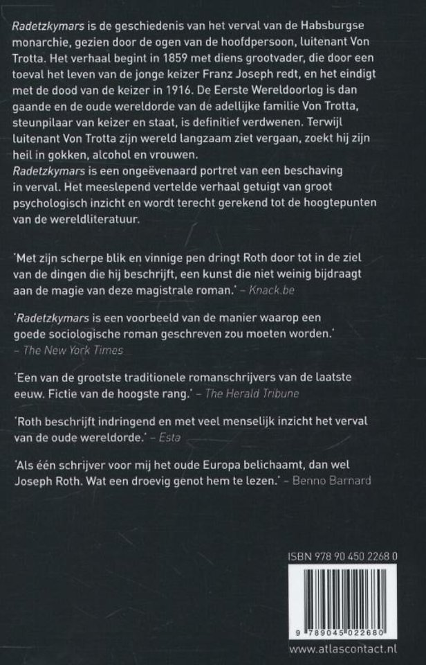'Radetzkymars' is de geschiedenis van het verval van de Habsburgse monarchie, gezien door de ogen van de hoofdpersoon, luitenant Von Trotta. Deze klassieker van Joseph Roth begint in 1859 met Von Trotta's grootvader, die door een toeval het leven van de jonge keizer Franz Joseph redt, en het eindigt met de dood van de keizer in 1916. De Eerste Wereldoorlog is dan gaande en de oude wereldorde van de adellijke familie Von Trotta, steunpilaar van keizer en staat, is definitief verdwenen. Terwijl luitenant Von Trotta zijn wereld langzaam ziet vergaan, zoekt hij zijn heil in gokken, alcohol en vrouwen. Radetzkymars is een ongeëvenaard portret van een beschaving in verval. Het meeslepend vertelde verhaal getuigt van groot psychologisch inzicht en wordt terecht gerekend tot de hoogtepunten van de wereldliteratuur.