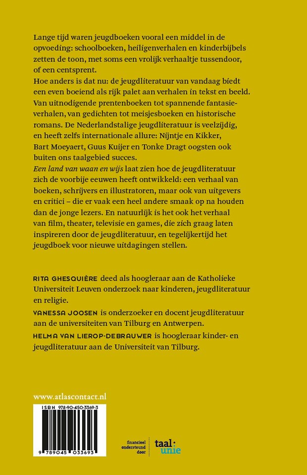 Een land van waan en wijs laat zien hoe de jeugdliteratuur zich de voorbije eeuwen heeft ontwikkeld: een verhaal van boeken, schrijvers en illustratoren, maar ook van uitgevers en critici – die er vaak een heel andere smaak op na houden dan de jonge lezers. En natuurlijk is het ook het verhaal van film, theater, televisie en games, die zich graag laten inspireren door de jeugdliteratuur, en tegelijkertijd het jeugdboek voor nieuwe uitdagingen stellen.