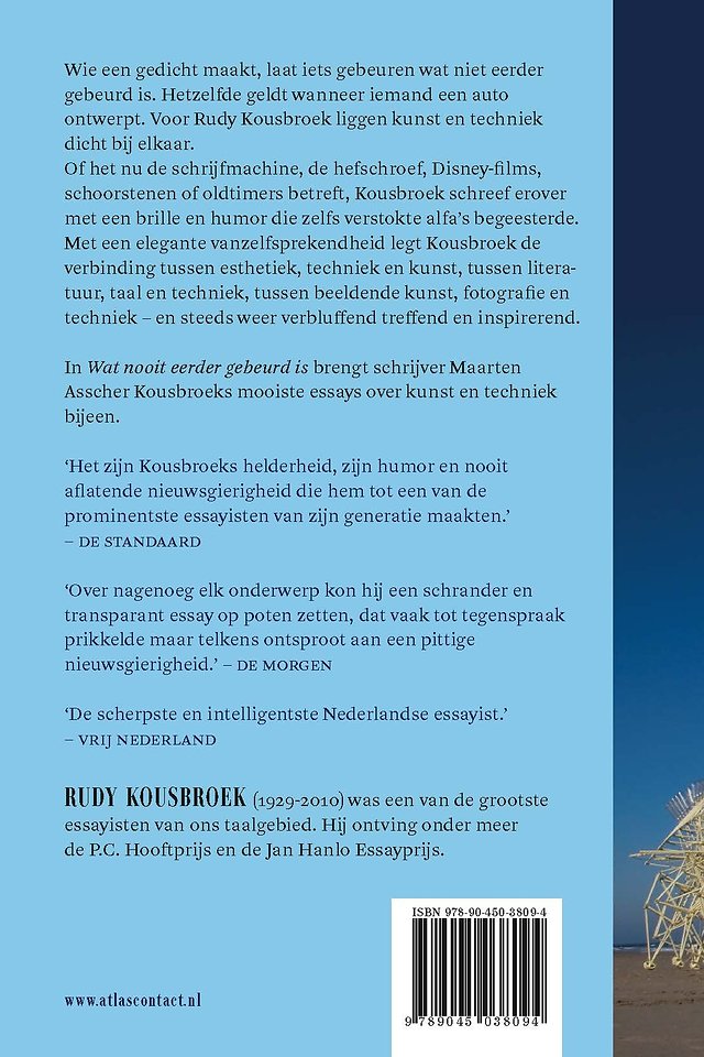 In 'Wat nooit eerder gebeurd is' brengt schrijver Maarten Asscher Kousbroeks mooiste essays over kunst en techniek bijeen. Wie een gedicht maakt, laat iets gebeuren wat niet eerder gebeurd is. Hetzelfde geldt wanneer iemand een auto ontwerpt. Voor Rudy Kousbroek liggen kunst en techniek dicht bij elkaar. Of het nu de schrijfmachine, de hefschroef, Disney-films, schoorstenen of oldtimers betreft, Kousbroek schreef erover met een brille en humor die zelfs verstokte alfa's begeesterde. Met een elegante vanzelfsprekendheid legt Kousbroek de verbinding tussen esthetiek, techniek en kunst, tussen literatuur, taal en techniek, tussen beeldende kunst, fotografie en techniek – en steeds weer verbluffend treffend en inspirerend.
