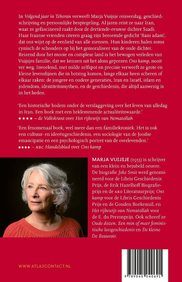 In Volgend jaar in Teheran verweeft Marja Vuijsje reisverslag, geschiedschrijving en persoonlijke bespiegeling. Al jaren reist ze naar Iran, waar ze gefascineerd raakt door de dertiende-eeuwse dichter Saadi. Haar Iraanse vrienden citeren graag zijn beroemde gedicht ‘Bani adam’, dat ons wijst op de eenheid van alle mensen. Hun kinderen halen soms cynisch de schouders op bij het gemoraliseer van de oude dichter.