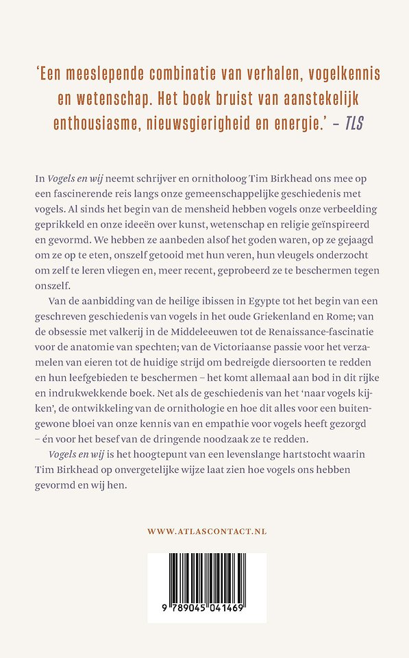 In ‘Vogels en wij’ neemt schrijver en ornitholoog Tim Birkhead ons mee op een fascinerende reis langs onze gemeenschappelijke geschiedenis met vogels. Al sinds het begin van de mensheid hebben vogels onze verbeelding geprikkeld en onze ideeën over kunst, wetenschap en religie geïnspireerd en gevormd. We hebben ze aanbeden alsof het goden waren, op ze gejaagd om ze op te eten, onszelf getooid met hun veren, hun vleugels onderzocht om zelf te leren vliegen en, meer recent, geprobeerd ze te beschermen tegen onszelf. ‘Vogels en wij’ is het hoogtepunt van een levenslange hartstocht waarin Birkhead op onvergetelijke wijze laat zien hoe vogels ons hebben gevormd en wij hen.