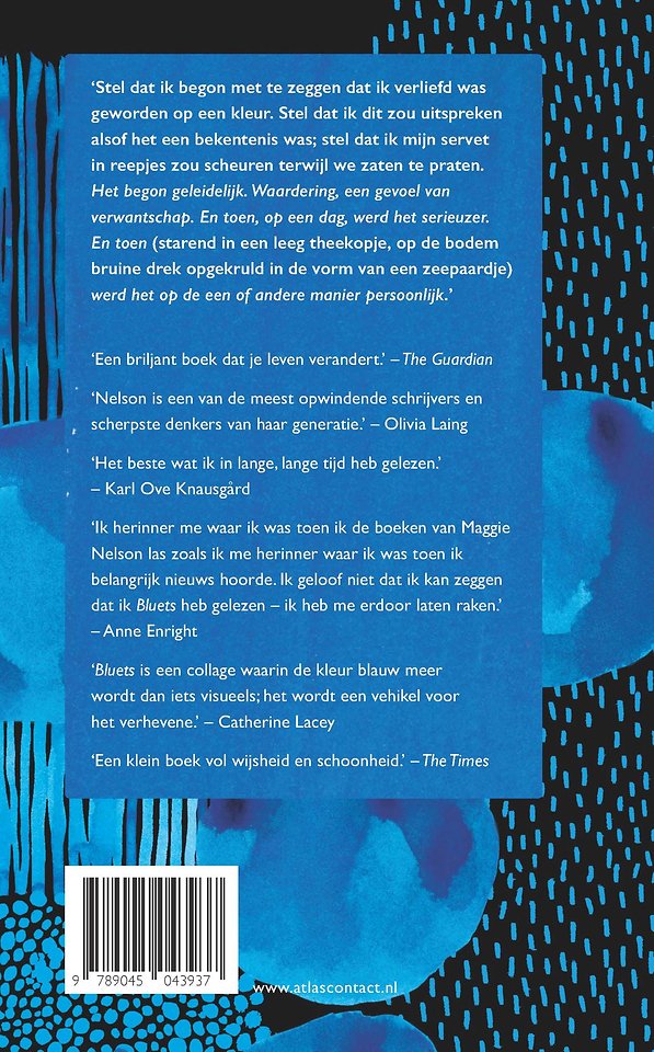Het uitgangspunt van 'Bluets' is een fascinatie met de kleur blauw. In een mozaïek van 240 korte teksten met thema’s als verlangen, kunstenaarschap, alcohol, vrouwelijke seksualiteit, plezier en pijn, cirkelt Maggie Nelson rondom die betekenisvolle en prachtige kleur. Ze beschrijft onder andere het pijnlijke einde van een liefdesrelatie en een ernstig ongeluk van een goede vriendin. Ze onderzoekt wat de waarde is van kunst en schoonheid in tijden van groot verdriet. De lezer blijft betoverd achter: hoe is het mogelijk dat iemand in woorden zo dicht bij het onzegbare kan komen? ‘Bluets’ is een rauwe, poëtische, onvergetelijke leeservaring.