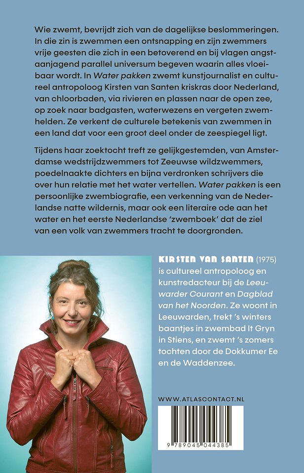 Wie zwemt, bevrijdt zich van de dagelijkse beslommeringen. In die zin is zwemmen een ontsnapping en zijn zwemmers vrije geesten die zich in een betoverend en bij vlagen angstaanjagend parallel universum begeven waarin alles vloeibaar wordt. In Water pakken zwemt kunstjournalist en cultureel antropoloog Kirsten van Santen kriskras door Nederland, van chloorbaden, via rivieren en plassen naar de open zee, op zoek naar badgasten, waterwezens en vergeten zwemhelden. Ze verkent de culturele betekenis van zwemmen in een land dat voor een groot deel onder de zeespiegel ligt.