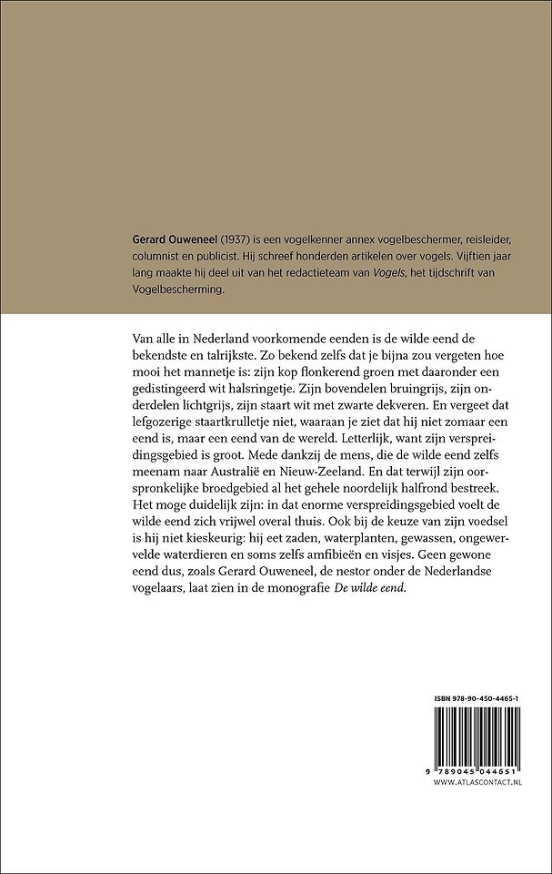 “De wilde eend’ van Gerard Ouweneel is en deel in de Vogelserie: ‘. Van alle in Nederland voorkomende eenden is de wilde eend de bekendste en talrijkste. Zo bekend zelfs dat je bijna zou vergeten hoe mooi het mannetje is: zijn kop flonkerend groen met daaronder een gedistingeerd wit halsringetje. Zijn bovendelen bruingrijs, zijn onderdelen lichtgrijs, zijn staart wit met zwarte dekveren. En vergeet dat lefgozerige staartkrulletje niet, waaraan je ziet dat hij niet zomaar een eend is, maar een eend van de wereld. Letterlijk, want zijn verspreidingsgebied is groot. Mede dankzij de mens, die de wilde eend zelfs meenam naar Australië en Nieuw-Zeeland. En dat terwijl zijn oorspronkelijke broedgebied al het gehele noordelijk halfrond bestreek. Het moge duidelijk zijn: in dat enorme verspreidingsgebied voelt de wilde eend zich vrijwel overal thuis. Ook bij de keuze van zijn voedsel is hij niet kieskeurig: hij eet zaden, waterplanten, gewassen, ongewervelde waterdieren en soms zelfs amfibieën en visjes. Geen gewone eend dus, zoals Ouweneel, de nestor onder de Nederlandse vogelaars, laat zien in de monografie ‘De wilde eend’.