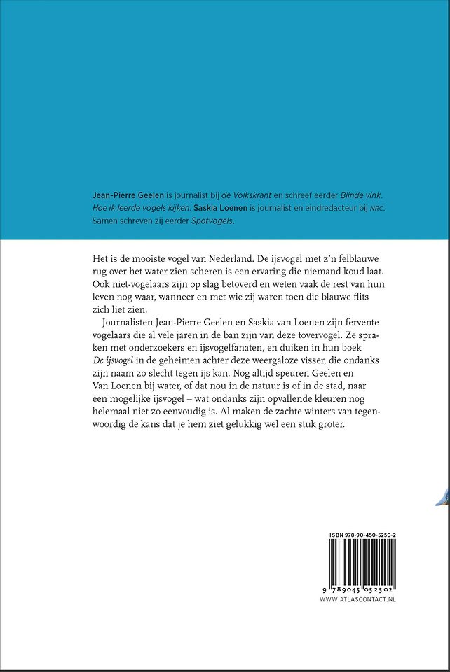 Het is de mooiste vogel van Nederland. De ijsvogel met z’n felblauwe rug over het water zien scheren is een ervaring die niemand koud laat. Ook nietvogelaars zijn op slag betoverd en weten vaak de rest van hun leven nog waar, wanneer en met wie zij waren toen die blauwe flits zich liet zien. Journalisten Jean-Pierre Geelen en Saskia van Loenen zijn fervente vogelaars en al vele jaren in de ban van deze tovervogel. Ze spraken met onderzoekers en ijsvogelfanaten en duiken in hun boek De ijsvogel in de geheimen achter deze weergaloze visser, die ondanks zijn naam zo slecht tegen ijs kan. Nog altijd speuren zij bij water, of dat nou in de natuur is of in de stad, naar een mogelijke ijsvogel – wat ondanks zijn opvallende kleuren nog helemaal niet zo eenvoudig is. Al maken de zachte winters van tegenwoordig de kans dat je hem ziet gelukkig wel een stuk groter.