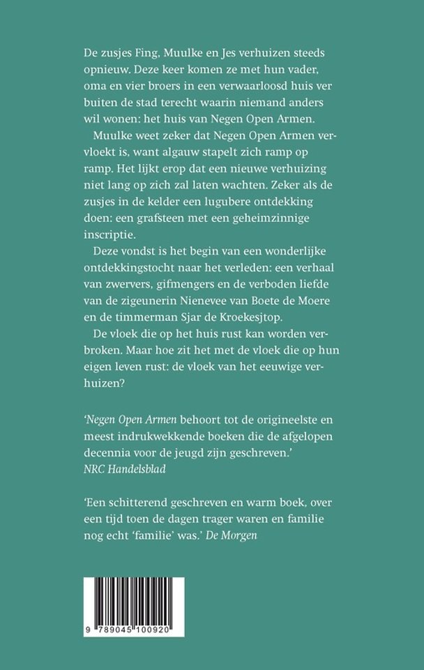 De zusjes Fing, Muulke en Jes verhuizen steeds opnieuw. Deze keer komen ze in een huis buiten de stad terecht: 'Het huis van de negen open armen'. Een vreemd huis is het. Muulke weet zeker dat het vervloekt is, want al gauw stapelt zich ramp op ramp. De vondst van een grafsteen met een geheimzinnige inscriptie is het begin van een wonderlijke ontdekkingstocht naar het verleden...