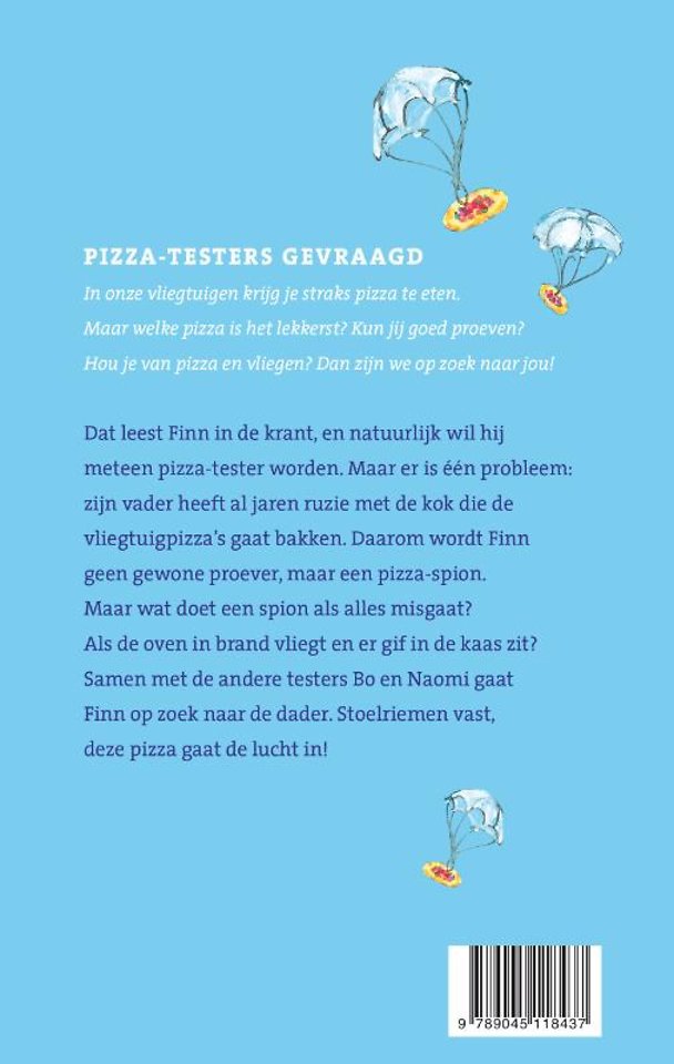 Dat leest Finn in de krant, en natuurlijk wil hij meteen pizza-tester worden. Maar er is één probleem: zijn vader heeft al jaren ruzie met de kok die de vliegtuigpizza’s gaat bakken. Daarom wordt Finn geen gewone proever, maar een pizza-spion. Maar wat doet een spion als alles misgaat?