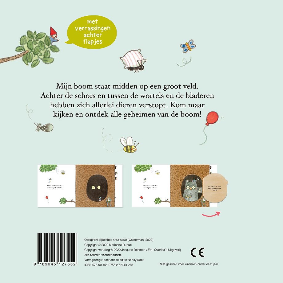 Midden op een groot veld staat een enorme boom. Je zou het zo niet zeggen, maar die boom zit vol met geheimen. Achter de schors en tussen de wortels en de bladeren hebben zich allerlei dieren verstopt. Een mol (die erg van boeken houdt) bijvoorbeeld, een zwerm bijen en een eekhoorn. Kijk onder de flapjes en ontdek alle verrassingen die in de boom verstopt zijn.