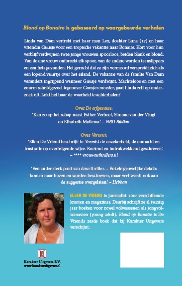 Linda van Dam vertrekt met haar man Lex, dochter Luna (17) en haar vriendin Guusje voor een tropische vakantie naar Bonaire. Kort voor hun verblijf verdwijnen twee jonge vrouwen spoorloos, beiden blank en blond. Van de ene vrouw ontbreekt elk spoor, van de andere worden teenslippers en een fiets gevonden. Het gerucht dat ze zijn vermoord verspreidt zich als een lopend vuurtje over het eiland. De vakantie van de familie Van Dam verandert ingrijpend wanneer Guusje verdwijnt. Machteloos en met een enorm schuldgevoel tegenover Guusjes moeder, gaat Linda zelf op onderzoek uit. Lukt het haar de waarheid te achterhalen?