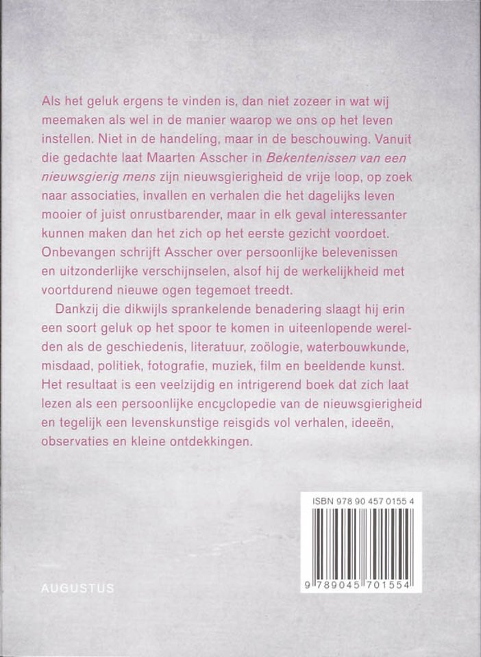 Als het geluk ergens te vinden is, dan niet zozeer in wat wij meemaken als wel in de manier waarop we ons op het leven instellen. Niet in de handeling, maar in de beschouwing. Vanuit die gedachte laat Maarten Asscher in Bekentenissen van een nieuwsgierig mens zijn nieuwsgierigheid de vrije loop, op zoek naar associaties, invallen en verhalen die het dagelijks leven mooier of juist onrustbarender, maar in elk geval interessanter kunnen maken dan het zich op het eerste gezicht voordoet.
