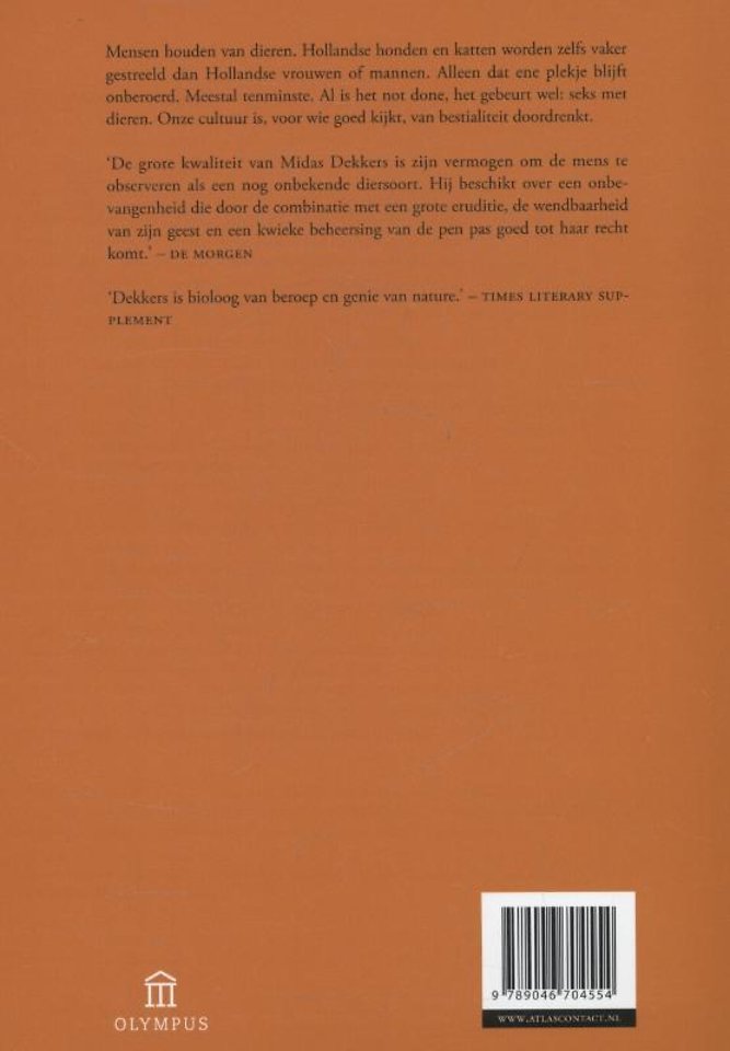Mensen houden van dieren. Hollandse honden en katten worden zelfs vaker gestreeld dan Hollandse vrouwen of mannen. Alleen dat ene plekje blijft onberoerd. Meestal tenminste. Als het not done is, het gebeurt wel: seks met dieren. Onze cultuur is, voor wie goed kijkt, van bestialiteit doordrenkt.