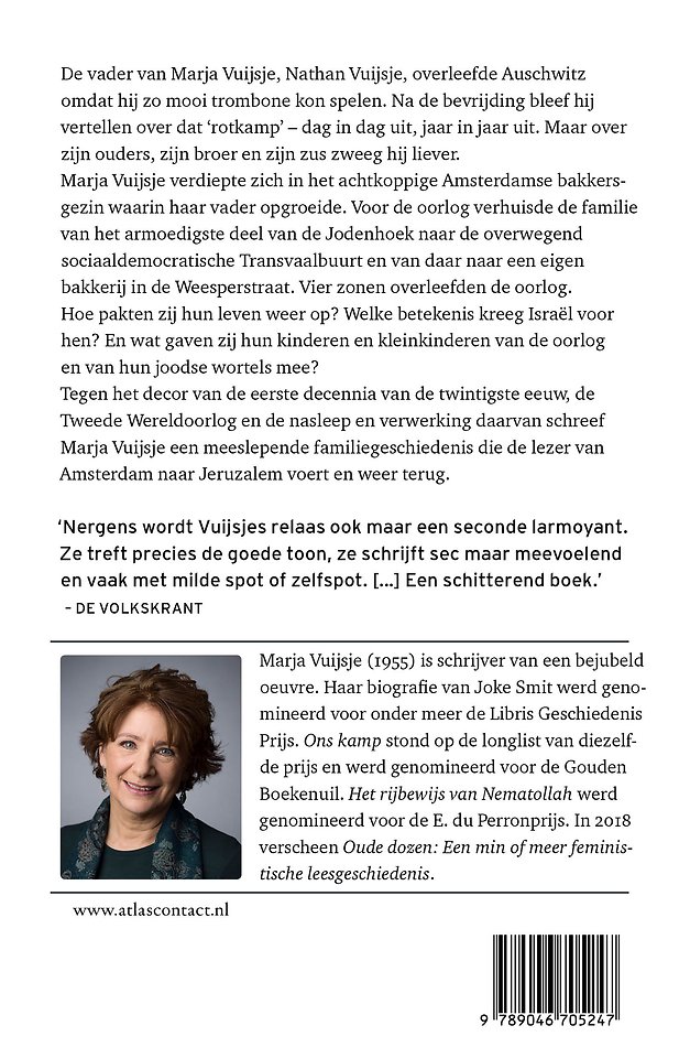 Marja Vuijsje verdiepte zich in het achtkoppige Amsterdamse bakkersgezin waarin haar vader opgroeide. Voor de oorlog verhuisde de familie van het armoedigste deel van de Jodenhoek naar de overwegend sociaaldemocratische Transvaalbuurt en van daar naar een eigen bakkerij in de Weesperstraat. Vier zonen overleefden de oorlog. Hoe pakten zij hun leven weer op? Welke betekenis kreeg Israel voor hen? En wat gaven zij hun kinderen en kleinkinderen van de oorlog en van hun joodse wortels mee?