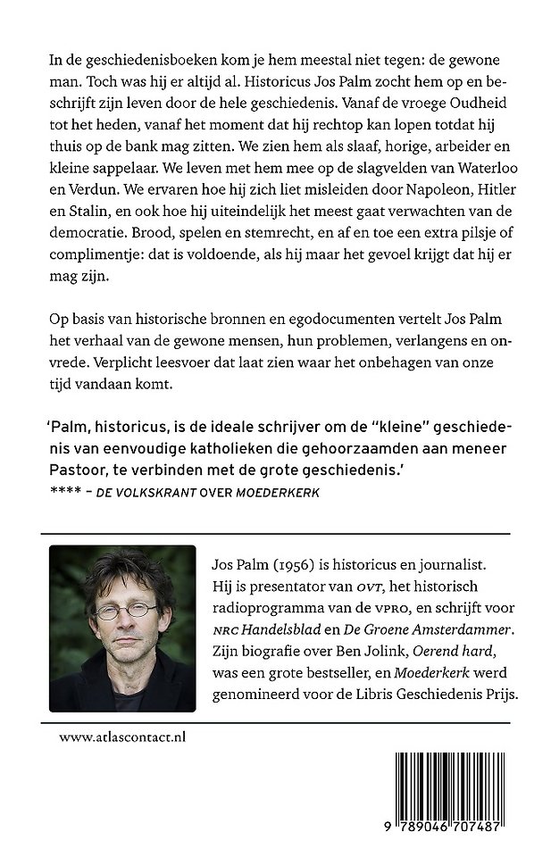 Op basis van historische bronnen en egodocumenten vertelt historicus Jos Palm in 'De gewone man' het verhaal van de kleine, gewone mensen, hun problemen, verlangens en onvrede. Want, in de geschiedenisboeken kom je hem meestal niet tegen: de gewone man. Toch was hij er altijd al. Palm zocht hem op en beschrijft zijn leven door de hele geschiedenis. Vanaf de vroege Oudheid tot het heden, vanaf het moment dat hij rechtop kan lopen totdat hij thuis op de bank mag zitten. We zien hem als slaaf, horige, arbeider en kleine sappelaar. We leven met hem mee op de slagvelden van Waterloo en Verdun. We ervaren hoe hij zich liet misleiden door Napoleon, Hitler en Stalin, en ook hoe hij uiteindelijk het meest gaat verwachten van de democratie. Brood, spelen en stemrecht, en af en toe een extra pilsje of complimentje: dat is voldoende, als hij maar het gevoel krijgt dat hij er mag zijn. Verplicht leesvoer dat laat zien waar het onbehagen van onze tijd vandaan komt.