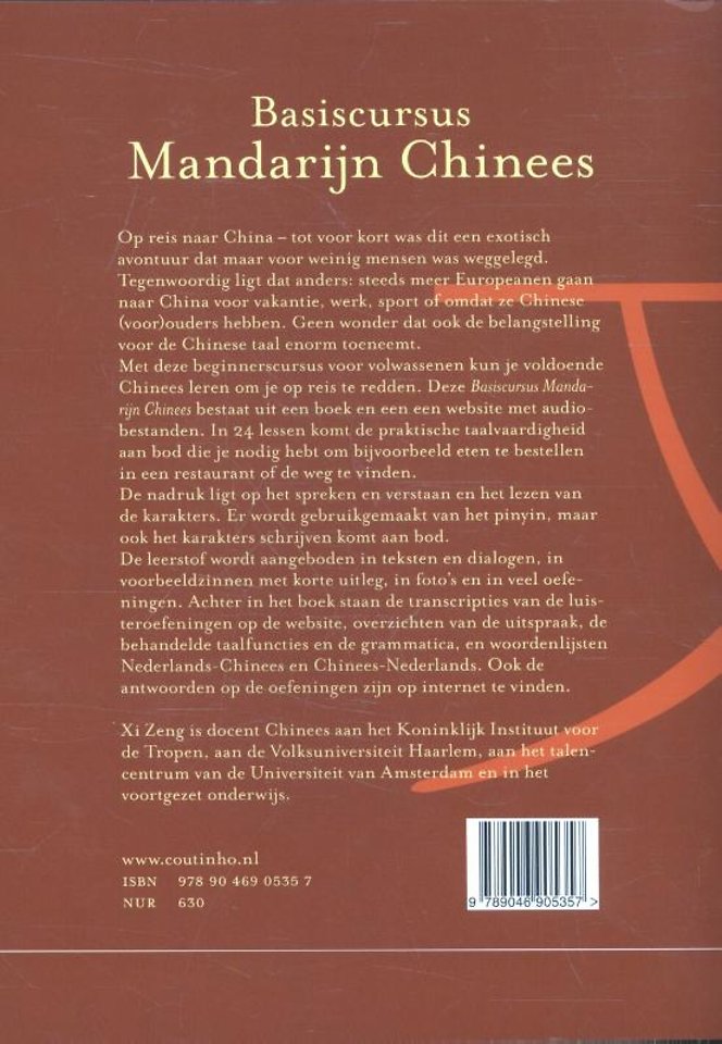 Deze Basiscursus Mandarijn Chinees bestaat uit een boek en een website met audiomateriaal. In 24 lessen komt de praktische taalvaardigheid aan bod die u nodig hebt om bijvoorbeeld eten te bestellen in een restaurant of de weg te vinden. De nadruk ligt op het spreken en verstaan en het lezen van de karakters. Er wordt gebruikgemaakt van het pinyin; maar ook het zelf karakters schrijven komt aan bod. De leerstof wordt aangeboden in teksten en dialogen, in voorbeeldzinnen met korte uitleg, in foto's en in veel oefeningen.