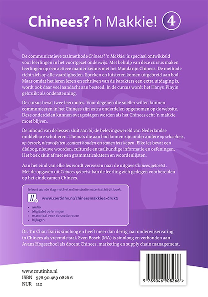 In deel 1 en 2 van Chinees? 'n Makkie! hebben de leerlingen al uitgebreid kennisgemaakt met de Chinese taal en in deel 3 worden de leerlingen uitgedaagd om hun kennis van het Chinees te vergroten. In het vierde deel wordt de informatie uit de vorige delen herhaald en is het pinyin nog maar summier aanwezig. Naast culturele onderwerpen is er in dit deel ook uitgebreid aandacht voor klassieke, moderne en hedendaagse Chinese literatuur. De cursus bevat twee leerroutes. Voor degenen die sneller willen kunnen communiceren in het Chinees zijn extra onderdelen op de website opgenomen. Voor wie het Chinees echt ’n makkie moet blijven, vormen de lessen zonder deze onderdelen ook een complete cursus.
