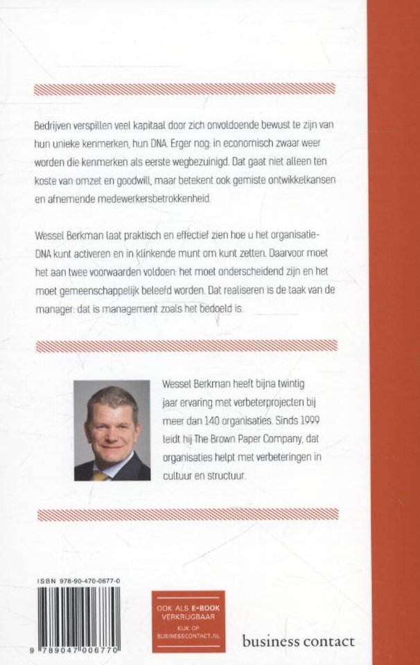 Berkman laat zien hoe u als manager het organisatie-dna kunt activeren en in klinkende munt om kunt zetten. Hij wijst onder meer op de gevaren van uniforme trainingen, Six Sigma, Lean, flexibele schillen en het nieuwe werken. Daarnaast helpt hij u een 'trusted advisor' van uw klant te worden en stuurt hij u en passant naar meer controle over de omzet.