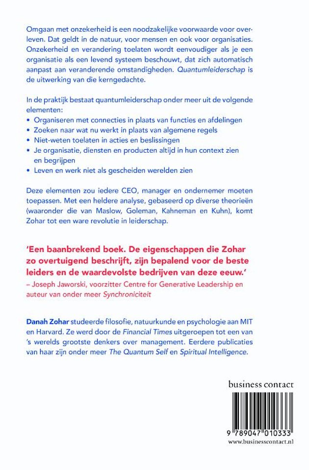 Meer over Danah ZoharOmgaan met fundamentele onzekerheid is een noodzakelijke voorwaarde voor overleven. Dat geldt voor de natuur, voor mensen en ook voor organisaties. Onzekerheid en verandering toelaten wordt eenvoudiger als je een organisatie als een levend systeem beschouwt, dat zich automatisch aanpast aan veranderende omstandigheden.