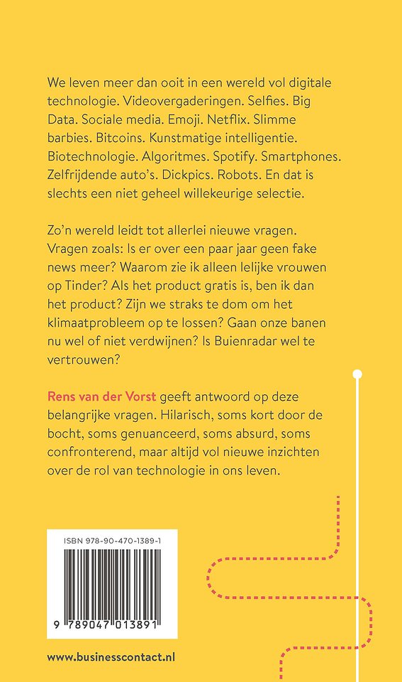 Zo’n wereld leidt tot allerlei nieuwe vragen. Zoals: Waarom zitten er alleen maar lelijke mannen op Tinder? Waarom wil je winnen van je navigatiesysteem? Waarom lijken je selfies niet op jou? Word je bespioneerd door je slimme stofzuiger? Waarom helpen de aanbevelingen van Netflix niet écht? Waarom wordt je leven niet beter van Buienradar?