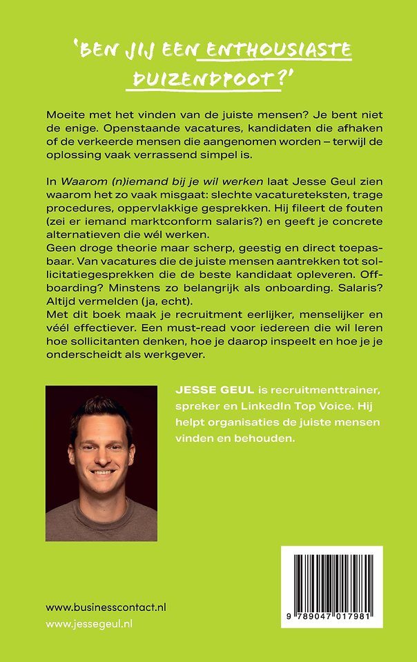 Ben jij een enthousiaste duizendpoot? Wervings- en selectieteksten wemelen van de clichés – en Jesse Geul prikt ze met flair door. In deze scherpe, geestige en ook gewoon praktische gids laat hij zien waarom het zo vaak misgaat in vacatureteksten en sollicitatieprocedures. Geen droge theorie, maar frisse en concrete tips en slimme alternatieven voor iedereen die goede mensen wil vinden én houden.