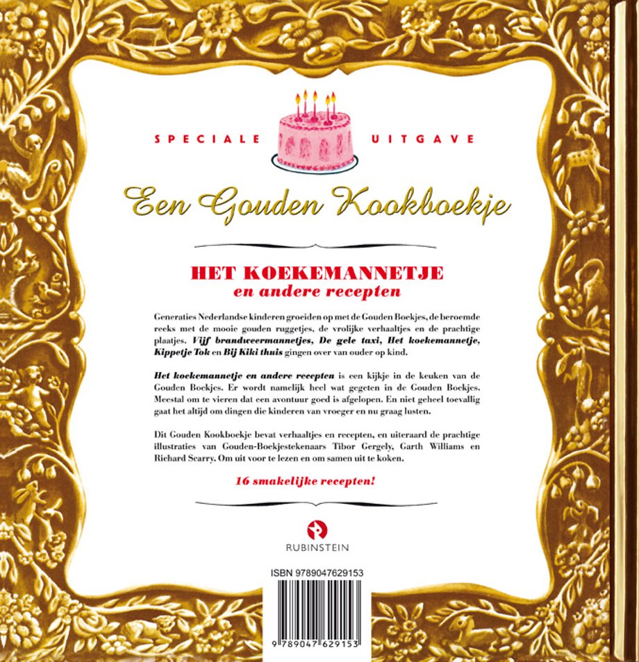 Generaties Nederlandse kinderen groeiden op met de Gouden Boekjes, de beroemde reeks met de mooie gouden ruggetjes, de vrolijke verhaaltjes en de prachtige plaatjes. Vijf brandweermannetjes, De gele taxi, Het koekemannetje, Kippetje Tok en Bij Kiki thuis gingen over van ouder op kind. Het koekemannetje en andere recepten is een kijkje in de keuken van de Gouden Boekjes. Er wordt namelijk heel wat gegeten in de Gouden Boekjes. Meestal om te vieren dat een avontuur goed is afgelopen. En niet geheel toevallig gaat het altijd om dingen die kinderen van vroeger en nu graag lusten.