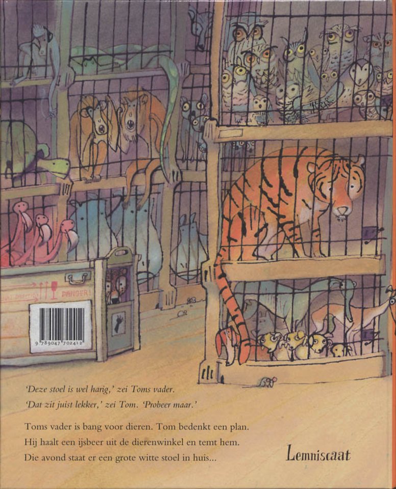 Toms vader is bang voor dieren: bang voor vlinders, slakken, eekhoorns... Wat Tim ook zegt, niets helpt. Zijn vader blijft bang - en blijft binnen. Tom wil niets liever dan zijn vader over zijn angst heen helpen en bedenkt een snedig plan. Hij haalt een ijsbeer uit de Duizend Dierenwinkel en temt hem. Die avond staat er een grote witte stoel in huis. 'Hij is wel harig,' zei Toms vader. 'Andere stoelen zijn niet zo harig.' 'Dat zit juist lekker,' zei Tom. 'Probeer maar.'