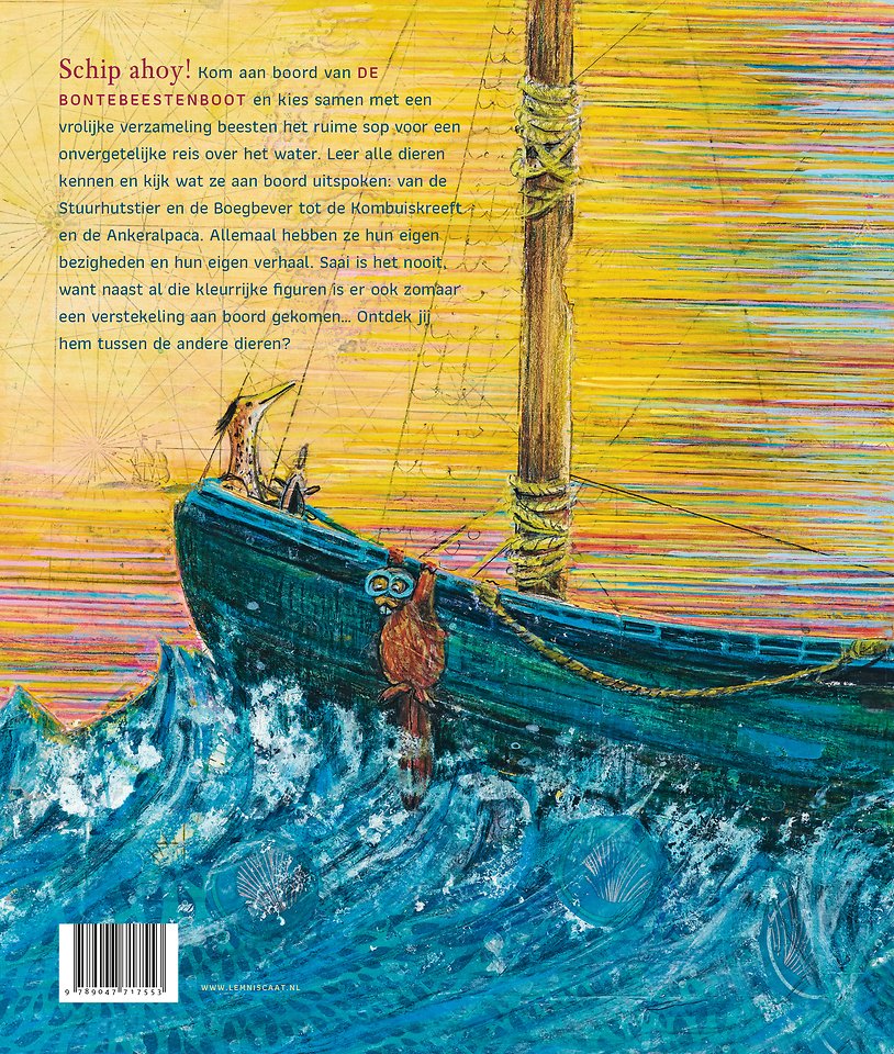 Schip ahoy! Kies samen met een bonte verzameling beesten het ruime sop voor een onvergetelijke reis over het water. Leer alle dieren kennen en kijk wat ze aan boord uitspoken: van de Stuurhutstier en de Boegbever tot de Kombuiskreeft en de Ankeralpaca. Allemaal hebben ze hun eigen bezigheden en hun eigen verhaal. Saai is het nooit, want naast al die illustere figuren is er ook zomaar een verstekeling aan boord gekomen… Ontdek jij hem tussen alle beesten?