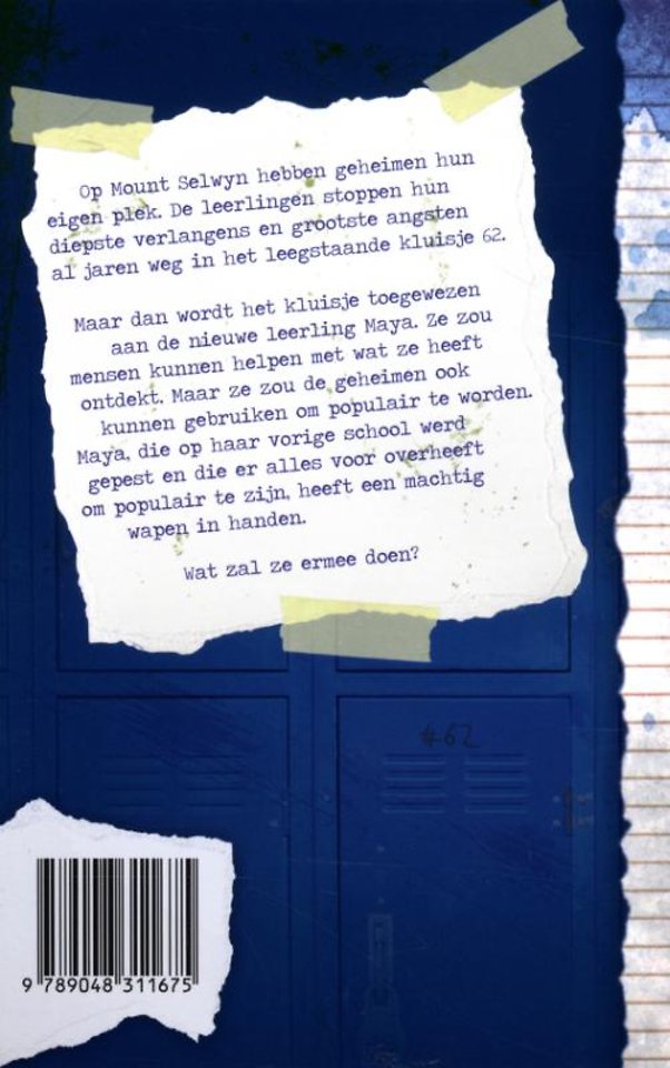 Vanaf het moment dat de populaire Hillary Randle dertien jaar geleden van de aardbodem verdween is haar kluisje, kluisje 62, nooit meer gebruikt. Althans, niet om studieboeken en gymtassen in op te bergen. In plaats daarvan hebben leerlingen hun diepste, donkerste geheimen op briefjes geschreven en in het kluisje geschoven, in de veronderstelling dat ze daar veilig waren. Dat waren ze ook, tot nieuwe leerlinge Maya op school verschijnt. Ze krijgt kluisje 62 toegewezen, en krijgt de geheimen er gratis bij. Zal ze deze gebruiken om populair te worden, of om anderen te helpen? Eén ding is zeker: in één klap is Maya één van de machtigste meisjes van de school...