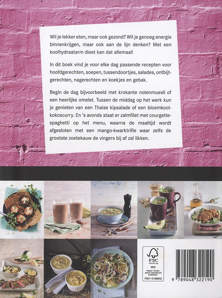 Begin de dag bijvoorbeeld met krokante notenmuesli of een heerlijke omelet. Tussen de middag op het werk kun je genieten van een Thaise kipsalade of een bloemkool-kokoscurry. En ’s avonds staat er zalmfilet met courgettespaghetti op het menu, waarna de maaltijd wordt afgesloten met een mango-kwarktrifle waar zelfs de grootste zoetekauw de vingers bij af zal likken.