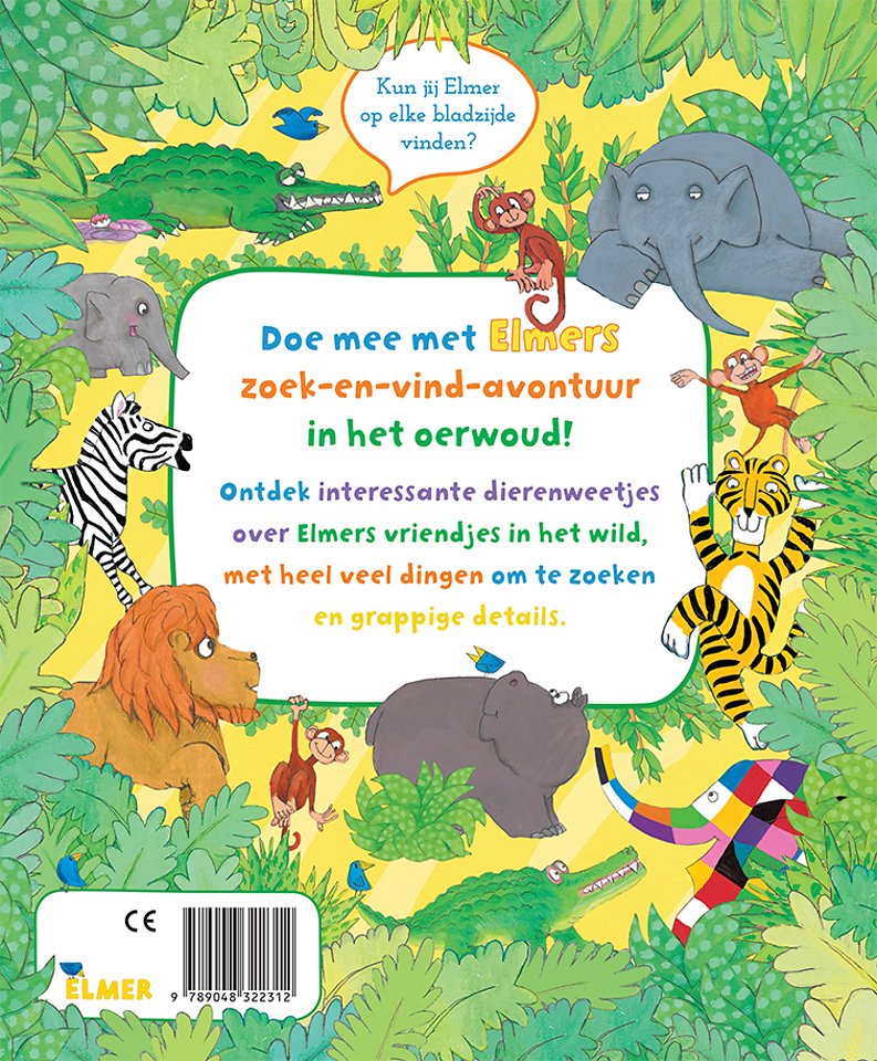 Kun jij Elmer op elke bladzijde vinden? Doe mee met Elmers zoek-en-vind-avontuur in het oerwoud!