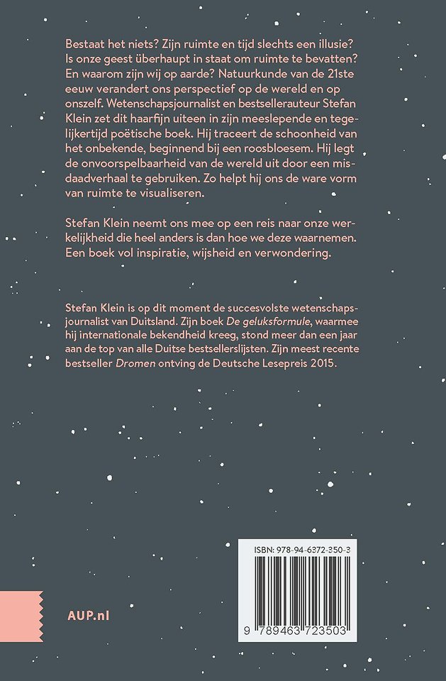 Bestaat het niets? Zijn ruimte en tijd slechts een illusie? Is onze geest überhaupt in staat om ruimte te bevatten? En waarom zijn wij op aarde? Natuurkunde van de 21ste eeuw verandert ons perspectief van de wereld en van onszelf. Wetenschapsjournalist en bestsellerauteur Stefan Klein zet dit haarfijn uiteen in zijn meeslepende en tegelijkertijd poëtische boek. Hij traceert de schoonheid van het onbekende, beginnend bij een roosbloesem. Hij legt de onvoorspelbaarheid van de wereld uit door een misdaadverhaal te gebruiken. Zo helpt hij ons de ware vorm van ruimte te visualiseren.