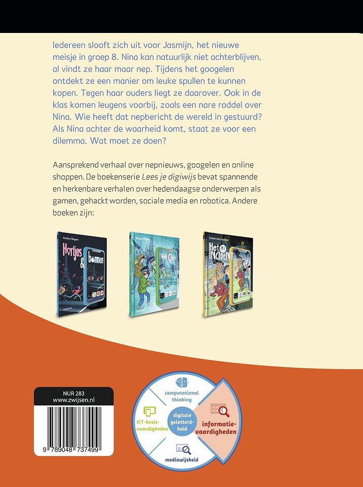 Herkenbaar verhaal over nepnieuws, googelen en producten aanschaffen voor lezers vanaf 10 jaar. Iedereen slooft zich uit voor Jasmijn, het nieuwe meisje in groep 8. Nina kan natuurlijk niet achterblijven. Nina googelt en ontdekt een manier om nieuwe kleren te kunnen betalen. Tegen haar ouders liegt ze over de spullen die ze heeft gekocht. Ook in de klas komen leugens voorbij, zoals een nare roddel over Nina. Wie heeft dat nepbericht de wereld ingestuurd? Als Nina achter de waarheid komt, staat ze voor een dilemma. Wat moet ze doen?