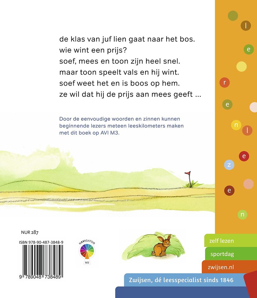 Herkenbaar leesboek op AVI M3, speciaal voor kinderen die net leren lezen. De klas van juf Lien gaat hardlopen in het bos. Toon speelt vals en wint. En wat er dan gebeurt … Door de korte woorden en eenvoudige zinnen kunnen beginnende lezers meteen leeskilometers maken.