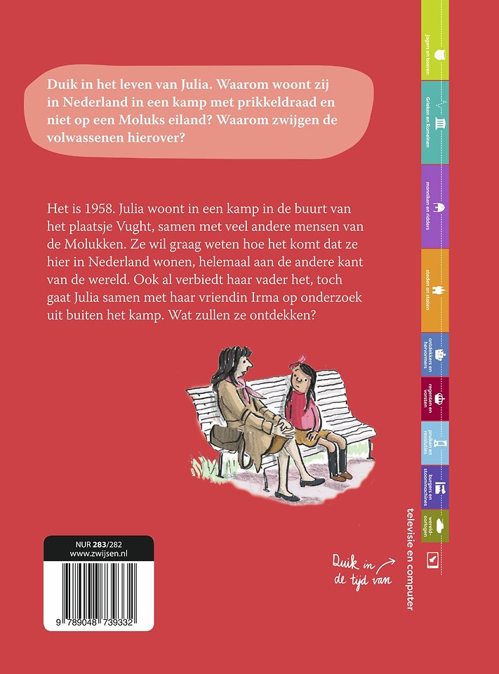 In dit indrukwekkende verhaal voor kinderen vanaf 9 jaar komt de recente geschiedenis echt tot leven. Duik in het jaar 1959 en lees over het leven van Julia. Zij woont in een kamp in de buurt van het plaatsje Vught, samen met veel andere mensen van de Molukken. Julia vraagt zich af hoe het komt dat ze hier in Nederland wonen. Waarom niet duizenden en duizenden kilometers ver weg, op een Moluks eiland? Maar ze is ook benieuwd naar het leven buiten het kamp. Ook al verbiedt haar vader het, toch gaat ze met haar vriendin Irma op onderzoek uit buiten het hek. Wat zullen ze ontdekken? Met veel interessante weetjes over deze periode uit de Nederlandse geschiedenis.