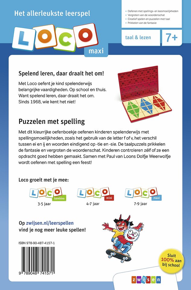 Met dit kleurrijke Loco oefenboekje oefenen kinderen spelenderwijs met spellingsmoeilijkheden, zoals het gebruik van de letter f of v, het verschil tussen ei en ij en woorden op -ig en -lijk. De creatieve taalpuzzels prikkelen de fantasie en vergroten de woordenschat. Samen met Paul van Loons Dolfje Weerwolfje wordt oefenen met spelling een feest!