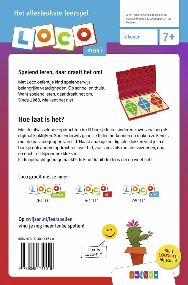 Met dit afwisselende Loco boekje oefenen kinderen de basisbegrippen van de tijd. Ze leren spelenderwijs tijden herkennen, zowel analoog als digitaal. Daarnaast zijn er puzzels waarin dag & nacht en de seizoenen voorkomen, en begrippen rond tijd geleerd worden. Leren klokkijken met Loco is nog nooit zo leuk geweest.