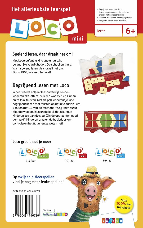 In het tweede halfjaar leesonderwijs kennen kinderen alle letters. Ze kunnen woorden en zinnen lezen en zelfs al teksten begrijpen! Met dit Loco pakket van Veilig leren lezen oefent een kind begrijpend lezen van teksten op het niveau van kern 7 t/m 11. Ook zonder de methode is dit pakket leerzaam én leuk! Met de twee boekjes en de basisdoos kunnen kinderen zélf aan de slag. Zijn de opdrachten goed gemaakt? Kinderen draaien de basisdoos om, controleren het figuur en ze weten het!