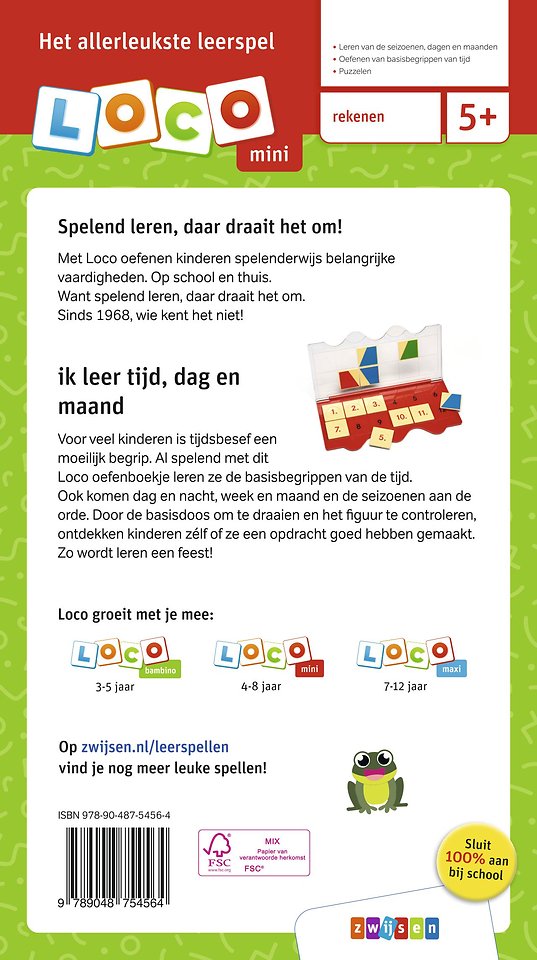 Voor veel kinderen is tijd een moeilijk begrip. Door te oefenen krijgen ze steeds meer tijdsbesef. Gelukkig is oefenen heel leuk met dit Loco mini oefenboekje. Al spelend ontdekken ze hoe laat het is. Dag & nacht, week & maand, de seizoenen en andere begrippen rond de tijd komen voorbij in vrolijke opdrachten met kleurrijke tekeningen. Door de basisdoos om te draaien en het figuur te controleren ontdekken kinderen zélf of ze een opdracht goed hebben gemaakt. Zo wordt de tijd leren makkelijker én leuker!