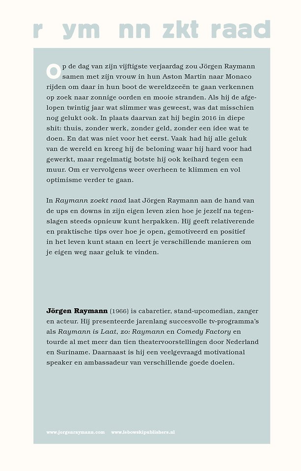 Meer over Jörgen RaymannOp de dag van zijn vijftigste verjaardag zou Jörgen Raymann samen met zijn vrouw in hun Aston Martin naar Monaco rijden om daar in hun boot de wereldzeeën te gaan verkennen op zoek naar zonnige oorden en mooie stranden. Als hij de afgelopen twintig jaar wat slimmer was geweest, was dat misschien nog gelukt ook. In plaats daarvan zat hij begin 2016 in diepe shit: thuis, zonder werk, zonder geld, zonder een idee wat te doen. En dat was niet voor het eerst. Vaak had hij alle geluk van de wereld en kreeg hij de beloning waar hij hard voor had gewerkt, maar regelmatig botste hij ook keihard tegen een muur. Om er vervolgens weer overheen te klimmen en vol optimisme verder te gaan.