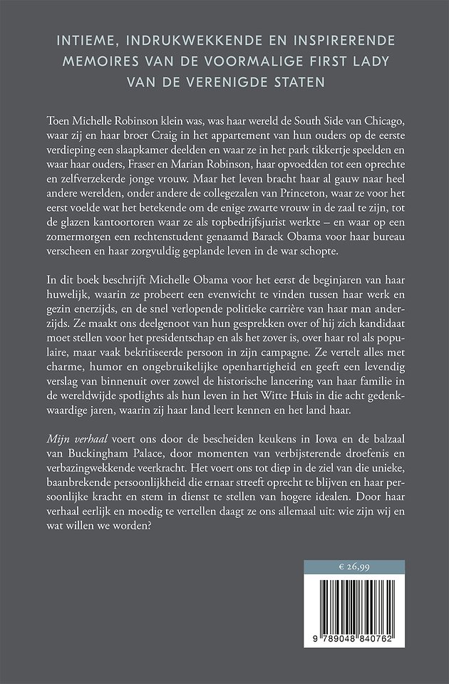 In haar betoverende en diep reflecterende memoires nodigt Michelle Obama haar lezers uit in haar wereld, door ervaringen die haar hebben gevormd vast te leggen - van haar jeugd in het zuiden van Chicago tot haar jaren als bestuurder, balancerend tussen de eisen van het moederschap en werk, tot haar tijd op 's werelds beroemdste adres. Met onfeilbare eerlijkheid en levendige humor beschrijft ze haar triomfen en tegenslagen, zowel publiek als privé, en vertelt ze haar verhaal zoals zij het beleefd heeft - in haar eigen woorden en op haar eigen voorwaarden. Warm, wijs en onthullend is Mijn verhaal - Becomingeen ongewoon intieme bespiegeling van een vrouw met kennis en bezieling die voortdurend en glansrijk beproevingen doorstond - en wiens verhaal ons inspireert om hetzelfde te doen.