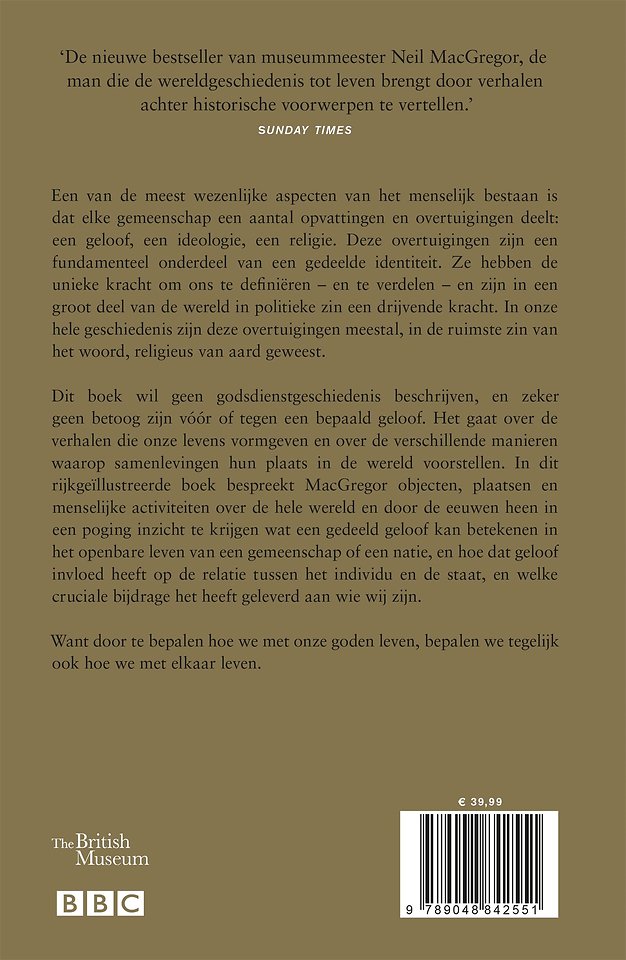 Dit boek wil geen godsdienstgeschiedenis beschrijven, en zeker geen betoog zijn vóór of tegen een bepaald geloof. Het gaat over de verhalen die onze levens vormgeven en over de verschillende manieren waarop samenlevingen hun plaats in de wereld voorstellen. In dit rijk geïllustreerde boek bespreekt MacGregor objecten, plaatsen en menselijke activiteiten over de hele wereld en door de eeuwen heen in een poging inzicht te krijgen wat een gedeeld geloof kan betekenen in het openbare leven van een gemeenschap of een natie, en hoe dat geloof invloed heeft op de relatie tussen het individu en de staat, en welke cruciale bijdrage het heeft geleverd aan wie wij zijn.