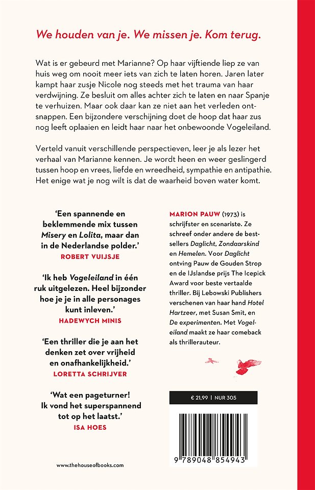 Wat is er gebeurd met Marianne? Op haar vijftiende liep ze van huis weg om nooit meer iets van zich te laten horen. Jaren later kampt haar zusje Nicole nog steeds met het trauma van haar verdwijning. Ze besluit om alles achter zich te laten en naar Spanje te verhuizen. Maar ook daar kan ze niet aan het verleden ontsnappen. Een bijzondere verschijning doet de hoop dat haar zus nog leeft oplaaien en leidt haar naar het onbewoonde Vogeleiland.