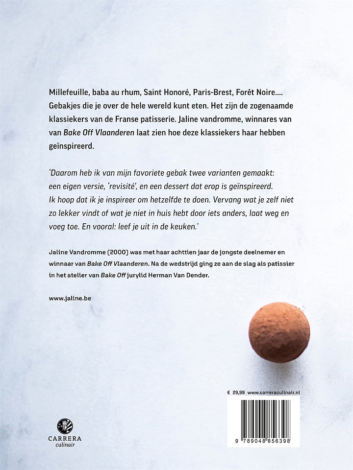 'Daarom heb ik van mijn favoriete gebak twee varianten gemaakt: een eigen versie, revisité, en een dessertje geïnspireerd op hetzelfde gebak. Vervang wat je zelf niet zo lekker vindt of wat je niet in huis hebt door iets anders, laat weg en voeg toe. En vooral: leef je uit in de keuken.'
