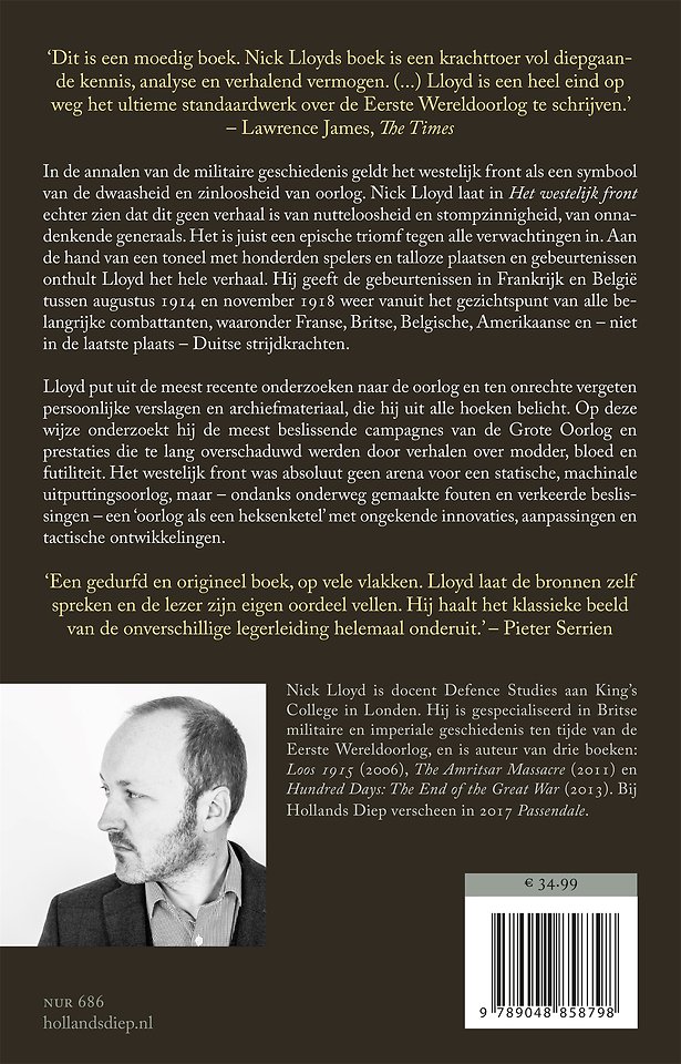 In de annalen van de militaire geschiedenis geldt het westelijk front als een symbool van de dwaasheid en zinloosheid van oorlog. Nick Lloyd laat in Het westelijk front echter zien dat dit geen verhaal is van nutteloosheid en stompzinnigheid, van onnadenkende generaals. Het is juist een epische triomf tegen alle verwachtingen in. Aan de hand van een toneel met honderden spelers en talloze plaatsen en gebeurtenissen onthult Lloyd het hele verhaal. Hij geeft de gebeurtenissen in Frankrijk en België tussen augustus 1914 en november 1918 weer vanuit het gezichtspunt van alle belangrijke combattanten, waaronder Franse, Britse, Belgische, Amerikaanse en - niet in de laatste plaats - Duitse strijdkrachten.